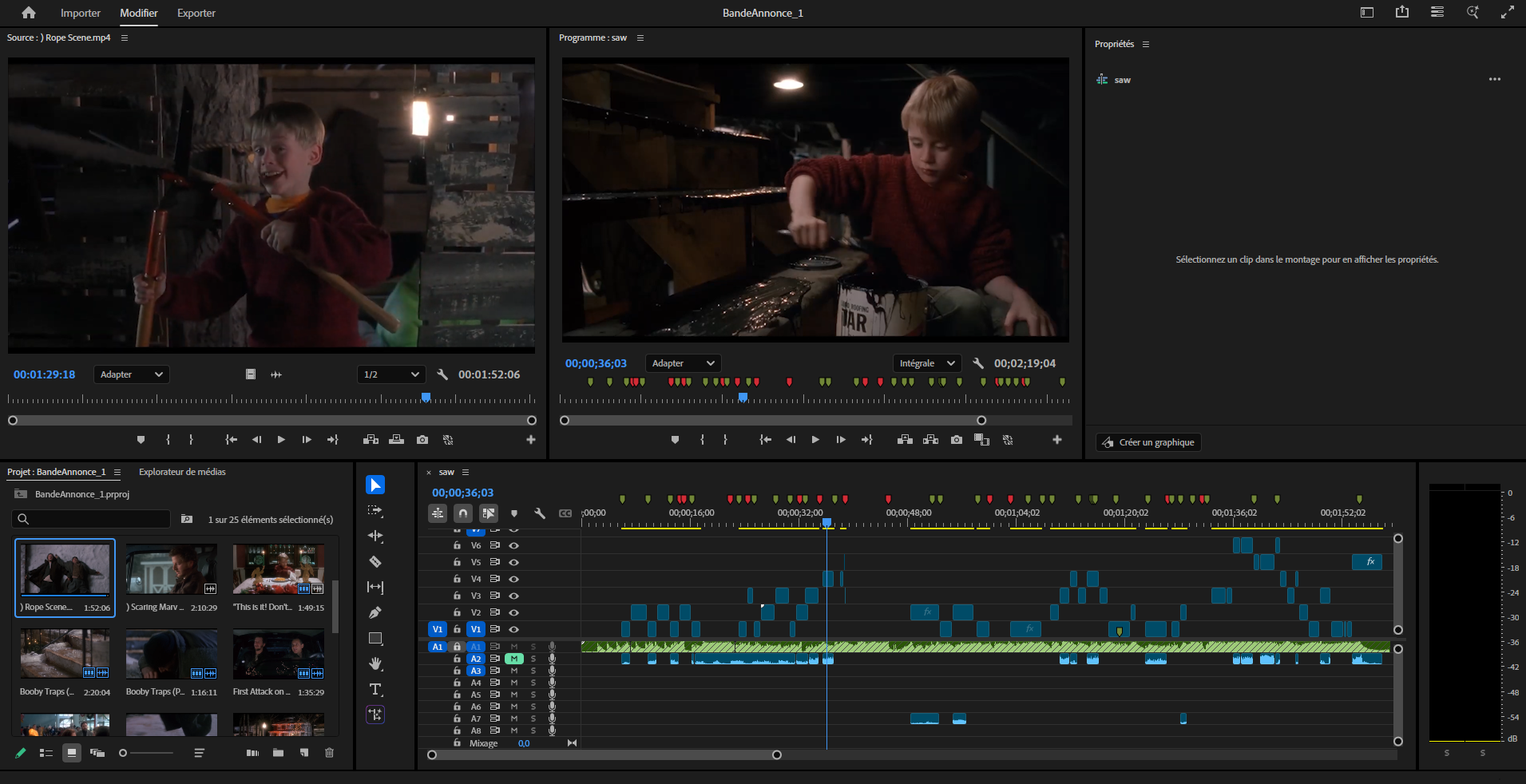 Dans ce projet, il était essentiel que toutes les voix entendues proviennent directement des personnages et non d’une voix off. J’ai donc minutieusement recherché des séquences où les personnages prononcent des mots correspondant le plus fidèlement possible à la trame sonore. Cela m’a demandé de placer un grand nombre de marqueurs avec précision dans le projet. De plus, j’ai veillé à ce que chaque voix reste clairement associée à un personnage, permettant ainsi au spectateur de reconnaître immédiatement que Kevin, dans le film, assume le rôle de l’antagoniste, renforçant le contraste humoristique de la séquence.